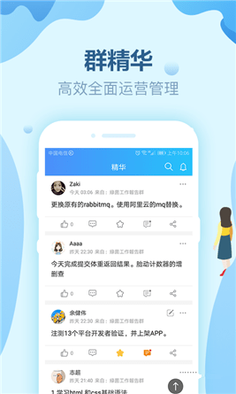 一款社群運(yùn)營類app,可定制工具,添加群焦點(diǎn),靈活自由群聊,帶給您不一樣的社群體驗(yàn)。自主生成精華,沉淀精華,自由評論點(diǎn)贊,隨時(shí)享受群精華帶來便攜。輕松在線無延遲即時(shí)聊天;群里面可以發(fā)送各種類型的精華,方便消息收藏與查找,還能提問指定用戶,高效解決消息沖突,再也不怕群里消息過多找不到消息內(nèi)容。
