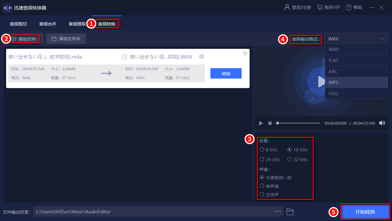將以上的音頻轉(zhuǎn)換準(zhǔn)備工作完成后,我們就可以選擇【文件輸出目錄】,自主選擇文件的保存位置。選擇完成后,點(diǎn)擊【開始轉(zhuǎn)換】就可以了。