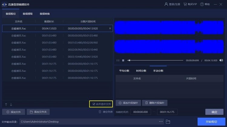 多種音頻剪切方式支持平均分割、時(shí)間分割、手動(dòng)分割
