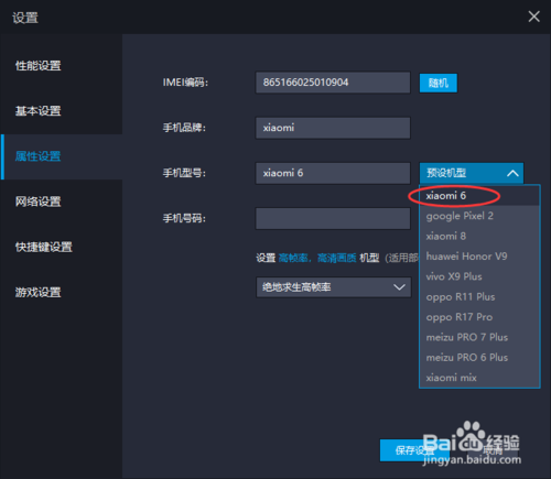 接著是屬性設(shè)置,找到設(shè)置高幀率的地方,選擇絕地求生,然后點(diǎn)擊右邊的一鍵設(shè)置,一定要一鍵設(shè)置,不然也是保存不到的;手機(jī)型號預(yù)設(shè)機(jī)型是xiaomi6,然后保存設(shè)置。