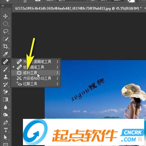 再在上面的屬性欄中,設置修補模式為內容識別,如圖所示。