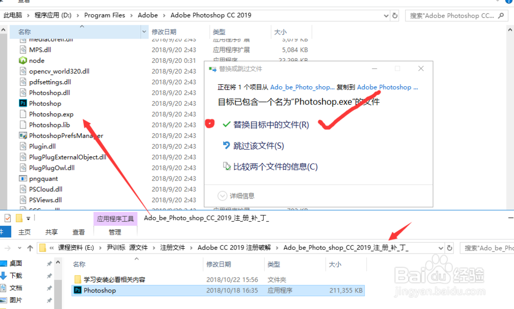 我們打開PSCC2019的根目錄,再打開我提供的替換補丁,把補丁復制到根目錄里面,然后進行替換。這里注意的是,補丁一定要復制,然后黏貼過去,千萬不要直接拖過去。這個補丁和以往的補丁不一樣了,這個補丁就是主程序補丁,就是PS的快捷方式那個補丁,你們打開補丁文件之后,Photoshop.exe這個文件就是補丁,替換就行。