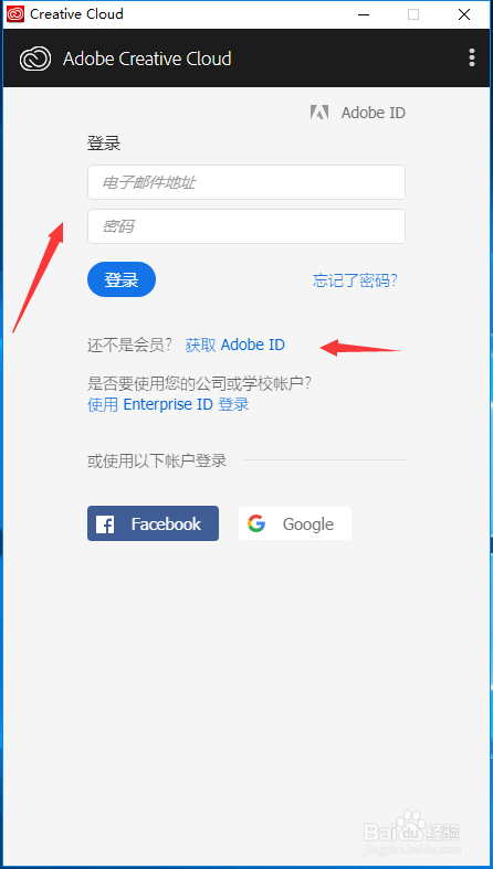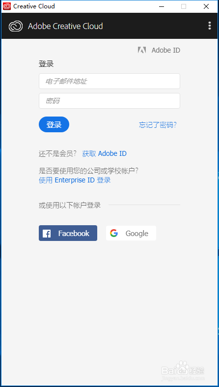 安裝完成之后,軟件會自動打開,如果你的電腦是第一次安裝Adobe軟件,那么他會提示你登錄你的Adobe賬號,如果沒有賬號可以點擊獲取AdobeID進行注冊一個。有賬號登錄之后就可以進入PS界面。