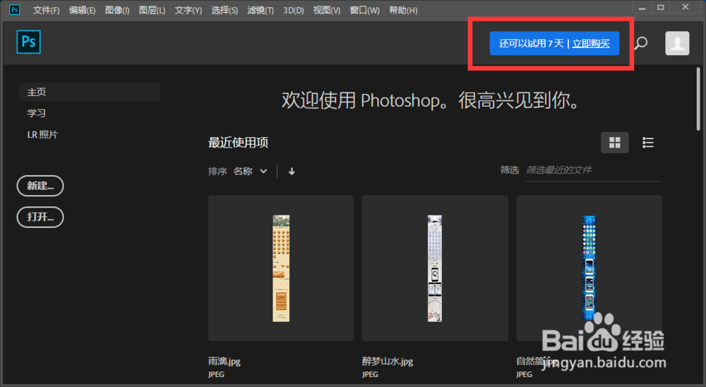 我們再次打開PSCC2019軟件,這個時候我們發(fā)現左上角的試用7天沒有了,那么我們就成功的安裝上軟件啦,接下來就可以正常使用了。如果一直在打轉的小伙伴,我們點擊左上角的PS圖標,直接進入工作區(qū)就可以了。