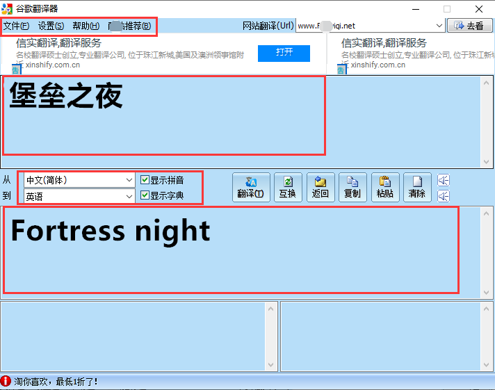 1、首先你在本站下載好谷歌翻譯器(google翻譯)軟件包打開后,會進入到谷歌翻譯器的主界面,如下圖所示,在界面上方有文件、設(shè)置、幫助、推薦等選項,在界面中有內(nèi)容框和語言選擇,接下來我們進行翻譯的步驟。(例如:輸入"堡壘之夜")