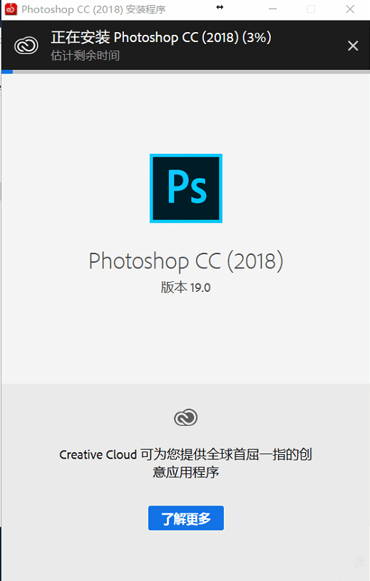 4.這個時候自動開始安裝了,軟件默認(rèn)是直接安裝到C盤的哦安裝路徑是C:\Program Files\Adobe\Adobe Photoshop CC 2018 之后破解軟件會需要用到這個路徑的哦!