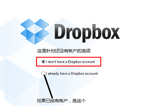 首先把 Dropbox 客戶端下載到電腦上,然后點(diǎn)擊安裝,接著會(huì)出現(xiàn)帳戶選項(xiàng)。這里有二個(gè)選項(xiàng),一個(gè)是針對(duì)還沒有創(chuàng)建 Dropbox 帳戶的,另外一個(gè)是已經(jīng)有帳戶的。如下圖所示