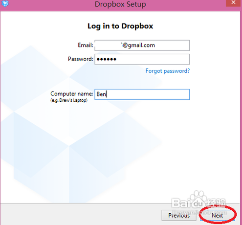 在這里,我輸入我自己的 Dropbox 帳戶和密碼,然后點(diǎn)擊“Next”如下圖所示
