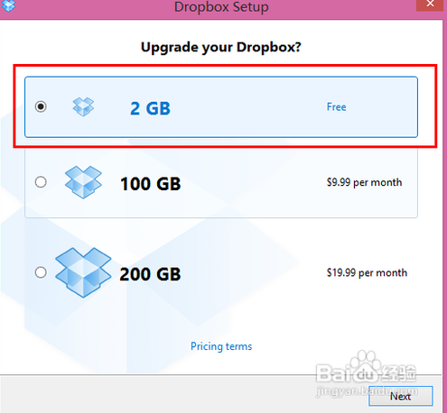 接下來,軟件會(huì)讓我們選擇使用的容量。默認(rèn)的是 2G 的免費(fèi)空間,另外還有二個(gè) 100G 和 200G 的分別是每月 9.99美元和 19.9美元。如下圖所示