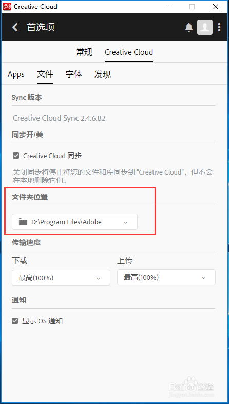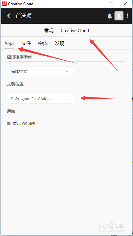 2、進入首選項之后,點擊“creative cloud” 第一個“apps”選項。下面有一個安裝位置,那這個設(shè)置一下,這個位置就是以后你安裝Adobe的所有軟件都會安裝在這個位置里面,設(shè)置一下即可,不要默認在C盤。