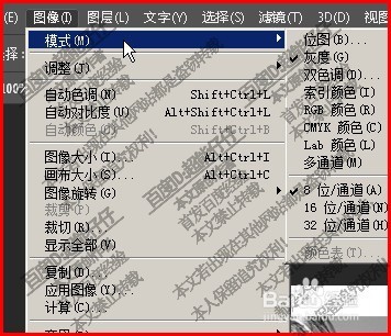 6、即時彈出一列菜單,鼠標放在模式這項中,右側(cè)彈出子菜單。可以看到在灰度這里已打上了對勾