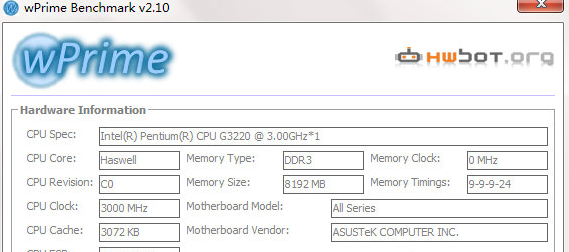 wPrime 大部分硬件信息感謝CPUz。它接收CPU信息,如時(shí)鐘速度、代碼名、緩存大小、電壓等。它接收主板模型和內(nèi)存的數(shù)量、速度和時(shí)間。