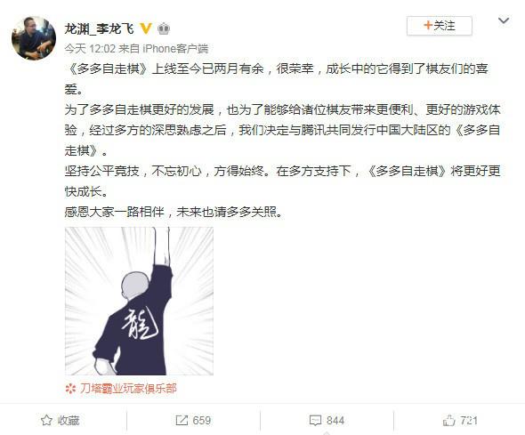 7月2日午間,《多多自走棋》的制作方龍淵網(wǎng)絡(luò)的CEO發(fā)表微博,他表示為了多多自走棋更好的發(fā)展,也為了能夠給諸位棋友帶來(lái)更便利、更好的游戲體驗(yàn)。在經(jīng)過(guò)龍淵和巨鳥多多工作室多方的深思熟慮之后,他們決定與騰訊共同發(fā)行中國(guó)大陸區(qū)的《多多自走棋》。而隨后《多多自走棋》的官方微博也表示《多多自走棋》馬上就可以使用QQ或者微信登陸了。