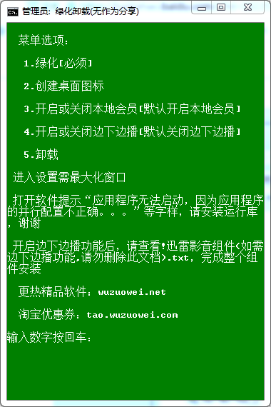 2.運行后,在里面輸入 “ 1 ”,當提示 “ 綠化完成,請盡情使用吧 ”,再輸入 “ 2 ” 創(chuàng)建桌面圖標,這個就可以在桌面直接打開使用了