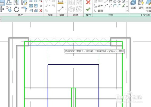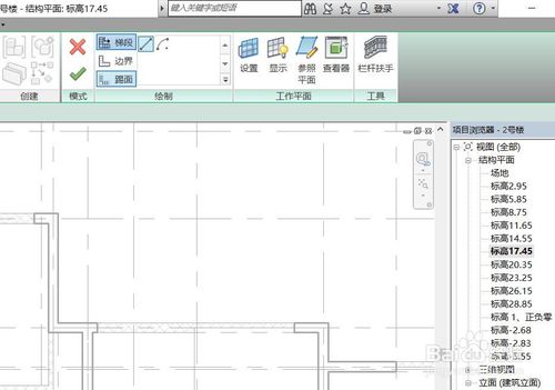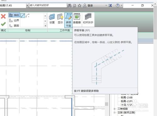 定義完成之后,需要根據設計圖紙信息,定位樓梯位置,筆者這里使用修改菜單中的參照平面工具定位樓梯位置。點擊參照平面按鈕,在視圖中繪制輔助軸線定位樓梯,如下圖。