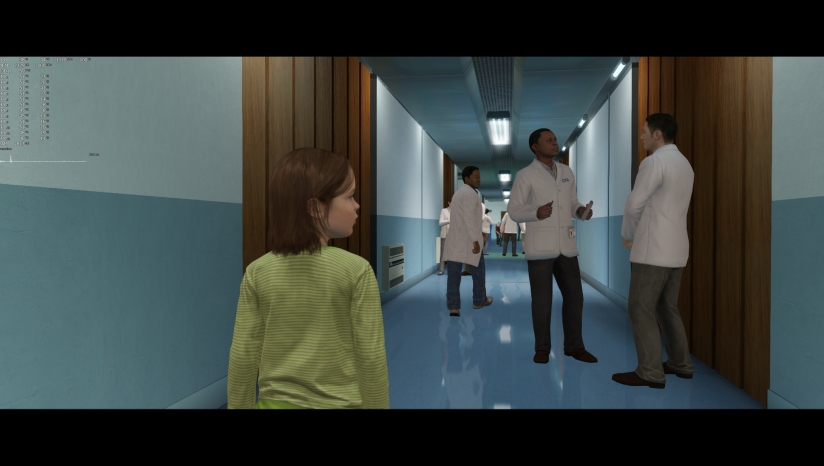 實(shí)驗(yàn)開場(chǎng)影像結(jié)束之后就可以操作祖迪了,本章都有操作說(shuō)明,使用右搖桿站起來(lái)之后可以在房間里四處逛逛,在柯爾的催促聲之下從房間來(lái)到實(shí)驗(yàn)室,期間可以在走廊聽聽研究員們的談話。進(jìn)入實(shí)驗(yàn)室之后開始試驗(yàn),按下△鍵切換到靈體艾登的視角,穿墻到隔壁房間查看女人手中的卡片圖案,再按一下△鍵回到祖迪的視角,使用左搖桿切換卡片,在正確的卡片上選擇×鍵,三次之后進(jìn)入下一個(gè)實(shí)驗(yàn)。