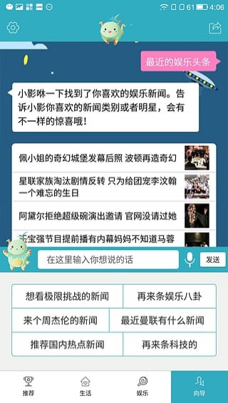 【資訊】直接發(fā)語音向小影查詢感興趣的新聞、近期電影及演唱會(huì)資訊。