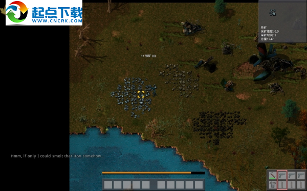 走近左邊的一片鐵礦,屏幕的右上角出現(xiàn)礦藏的說明:采礦名稱、采礦難度、費時和總量,用斧頭開采4份鐵礦,再采一些石塊,制作一座石爐。