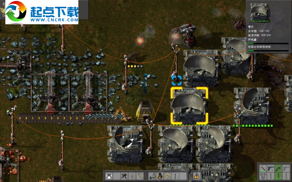 接下來造雷達,需要鐵板和銅板,這就意味著要開采鐵礦和銅礦,電能采掘機要比熱能采掘機快得多。在附近的鐵礦和銅礦上布置好生產(chǎn)線,再用電線桿將電力輸送過去,給石爐加好煤,可以生產(chǎn)出鐵板和銅板了。