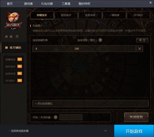 dnf官方助手特權(quán)一、 按鍵連發(fā)您可以通過助手將常用的按鍵設(shè)置成連發(fā)按鈕。游戲時(shí),只需按住該按鍵不放即可發(fā)揮連發(fā)作用。