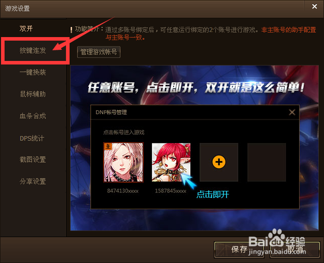 打開游戲設(shè)置,在游戲設(shè)置上方有雙開,按鍵連發(fā),一鍵換裝。這里應(yīng)把按鍵連發(fā)勾選上