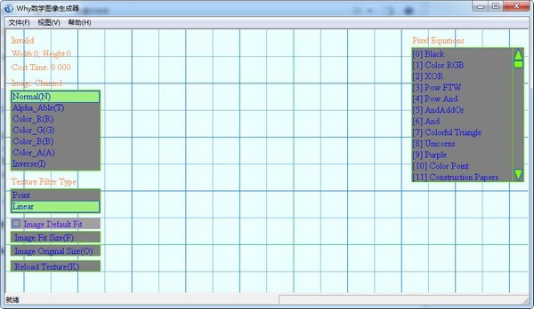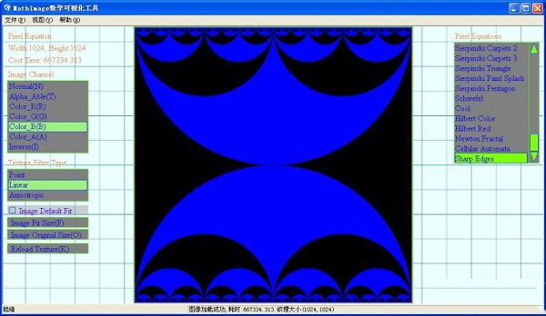 軟件中含有近百種數(shù)學(xué)圖像生成的算法,如Mandelbrot,JuliaSets之類(lèi)的分形算法。首先介紹下該軟件的基本功能,這是一款與圖像有關(guān)的軟件,所以圖像加載顯示功能是必需的,軟件支持的圖像格式有:jpg,jpg,dds,bmp,tga,ppm。用戶可以將文件直接拖入窗體內(nèi)以打開(kāi)圖像,也可以通過(guò)菜單項(xiàng)或快捷方式Ctrl+F選擇文件加載。下圖為軟件界面: