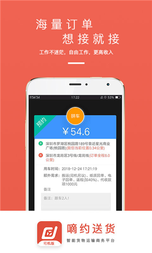 1、海量訂單:隨時隨地都能接到訂單,收入豐厚有保障。2、智能接單:平臺采取更智能的訂單派搶方式,讓您可以自由接單。