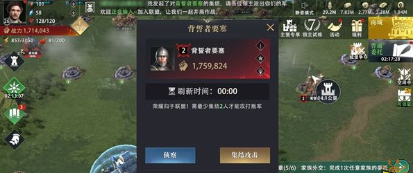 集結(jié)攻擊玩法并不是通過(guò)外交大廳發(fā)起,而是進(jìn)攻敵對(duì)領(lǐng)主、背誓者要塞等強(qiáng)大敵人方可選擇的操作。在選中敵人后,領(lǐng)主可在進(jìn)攻界面看到【集結(jié)攻擊】按鈕,點(diǎn)擊集結(jié)攻擊即可邀請(qǐng)盟友,一同對(duì)敵人發(fā)起攻擊。