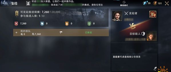 發(fā)起集結(jié)的領(lǐng)主打開(kāi)集結(jié)面板后,可查看參與集結(jié)盟友的人數(shù)、盟友集結(jié)兵力等信息。也可通過(guò)右下角的公告面板,編輯公告信息。