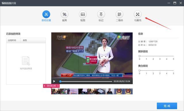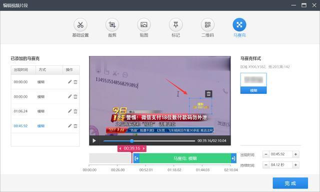 如果遇到視頻中間的一部分需要去水印,播放視頻,播放到需要去水印的地方后,用剪刀將其剪成獨(dú)立片段,然后在這一個(gè)片段上單獨(dú)添加馬賽克即可。不影響其它的視頻片段,操作方法如圖。