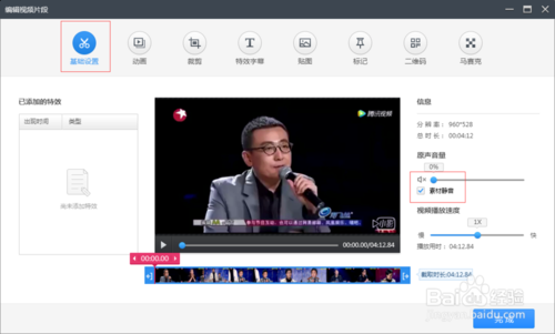 點(diǎn)擊鉛筆圖標(biāo),打開(kāi)編輯頁(yè)面,在基礎(chǔ)設(shè)置頁(yè)面右邊原聲音量可以把聲音關(guān)小也可以直接點(diǎn)擊素材靜音前面的框打鉤就可以消去原聲,點(diǎn)擊完成即可。