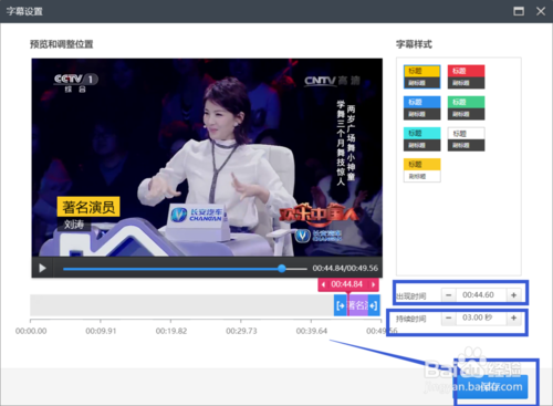 設(shè)置字幕的持續(xù)時(shí)間,可以直接在時(shí)間軌道上拖動(dòng)設(shè)置,也可以在如圖所示的時(shí)間框中輸入起始時(shí)間和持續(xù)時(shí)間數(shù)值,在視頻里依次添加需要的字幕。完成之后點(diǎn)擊 保存 按鈕