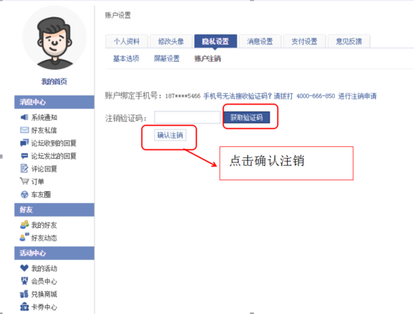 7、點(diǎn)擊“獲取驗(yàn)證碼”,把收到的驗(yàn)證碼填入“注銷驗(yàn)證碼”,最后點(diǎn)擊確認(rèn)注銷。