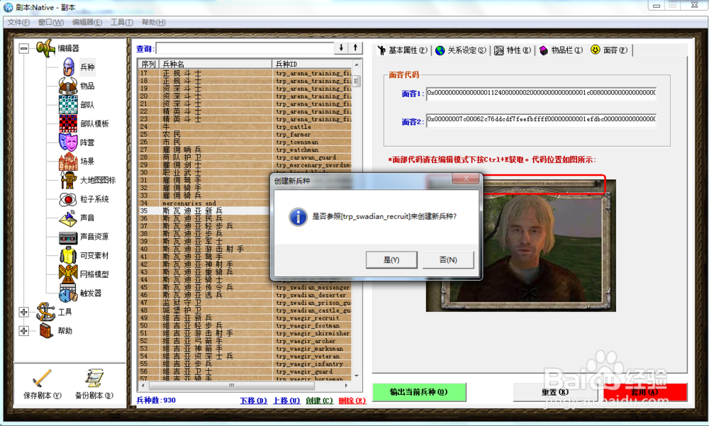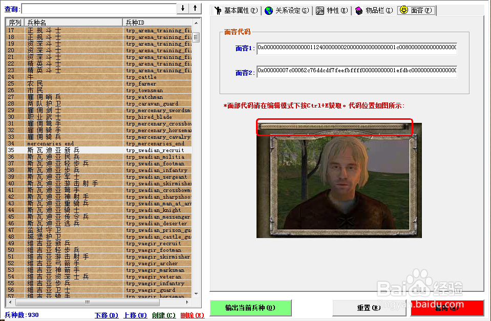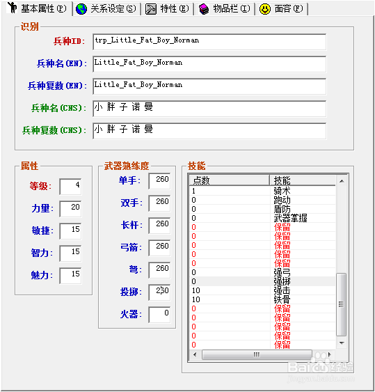 基本屬性、關(guān)系、特性、物品、面貌來查看某個兵種的特性和上面的修改方法一樣修改,所有的都修改完畢了以后,點擊右下角紅色的套用