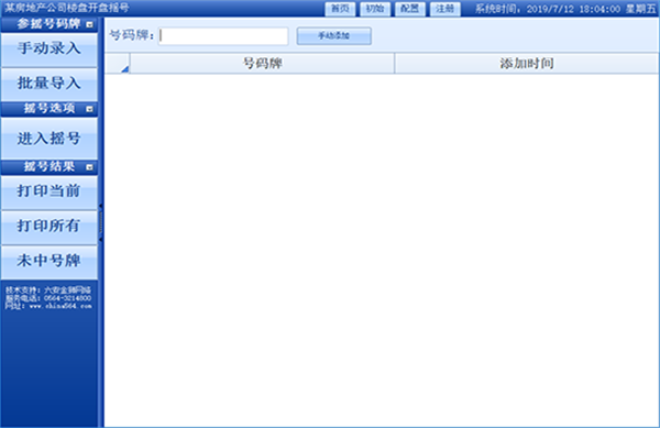 金獅樓盤隨機(jī)搖號系統(tǒng)支持?jǐn)?shù)據(jù)批量導(dǎo)入和手動錄入,搖號方式可以分批搖號、搖順序號、逐一搖號等各種方式,搖號過程中數(shù)據(jù)隨機(jī)匹配,公平公正,搖號結(jié)果支持打印、查詢、導(dǎo)出Excel和Word等電子文檔,方便存檔,軟件界面功能清晰明了,操作起來簡單易用,我們提供遠(yuǎn)程演示軟件和語音解說。另外我們提供軟件定制,可以根據(jù)客戶的需求來針對性定制開發(fā)軟件。