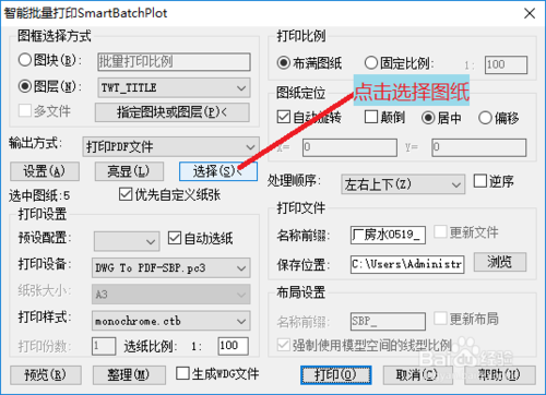 【5】選擇指定的打印機(jī),這里選擇DWG TO PDF-SBP打印機(jī),因?yàn)樵摯蛴C(jī)含有所需的紙張。