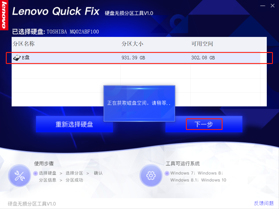 您可以選擇要分割的磁盤,點擊下一步,軟件提示正在獲取磁盤分區(qū),本例中選擇的是TOSHIBA 931.51GB的硬盤進行演示,如圖: