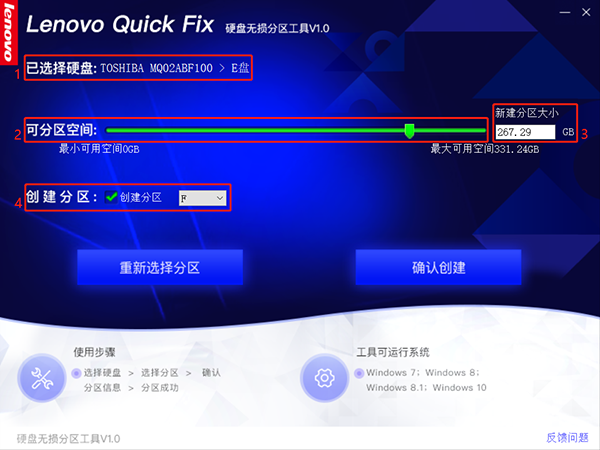 本工具支持在操作系統(tǒng)中,在不影響硬盤數據的情況下把分區(qū)的可用空間劃分出來新建硬盤分區(qū)。