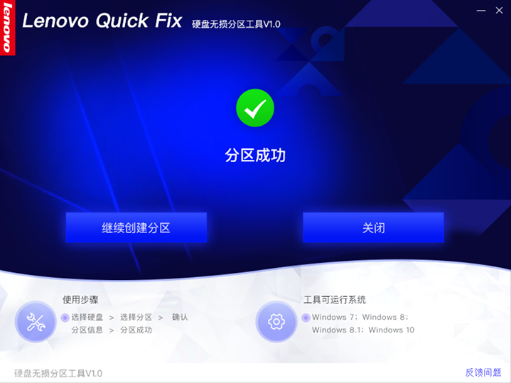 分區(qū)成功將出現(xiàn)提示,您可以選擇關閉,也可以繼續(xù)創(chuàng)建分區(qū),如圖: