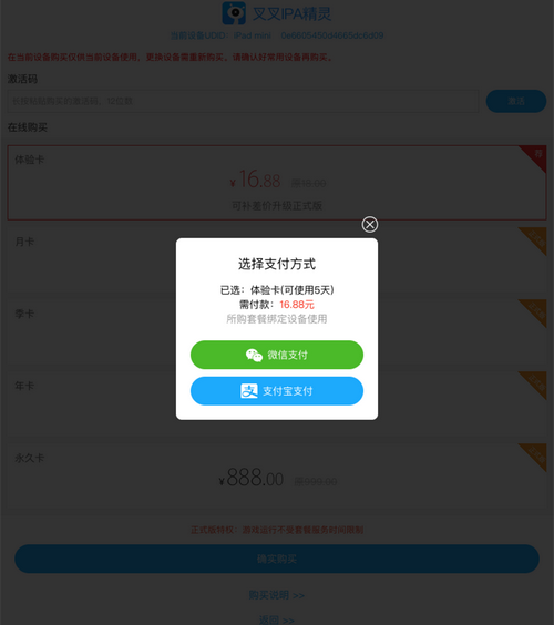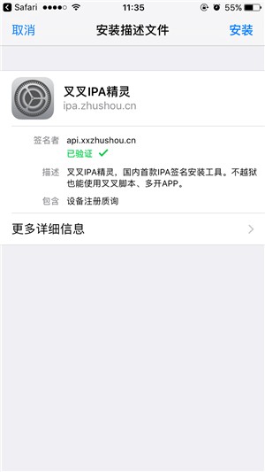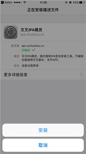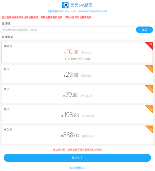 叉叉IPA精靈需要購買套餐才能安裝并使用,購買時(shí)需捆綁唯一設(shè)備號,在該設(shè)備上進(jìn)行使用。目前安裝過程中跳去系統(tǒng)設(shè)置“安裝描述文件”的步驟可以理解成獲取當(dāng)前設(shè)備號。