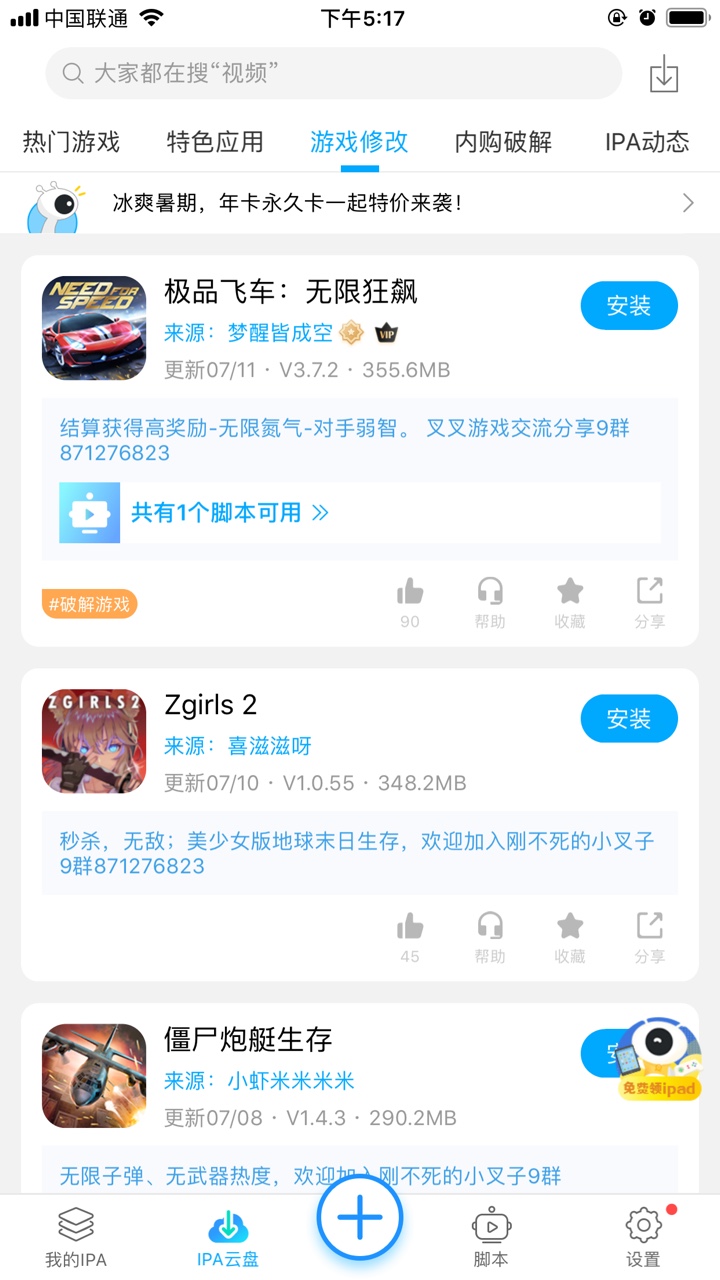在叉叉IPA精靈中有十分豐富的云盤資源,玩家只需在云盤中搜索對應(yīng)的游戲名,然后點(diǎn)擊安裝,進(jìn)入到打包工具臺,勾選需要的功能(腳本模塊、加速器模塊、多開等等)然后進(jìn)行簽名打包再下載到手機(jī)內(nèi)安裝即可。