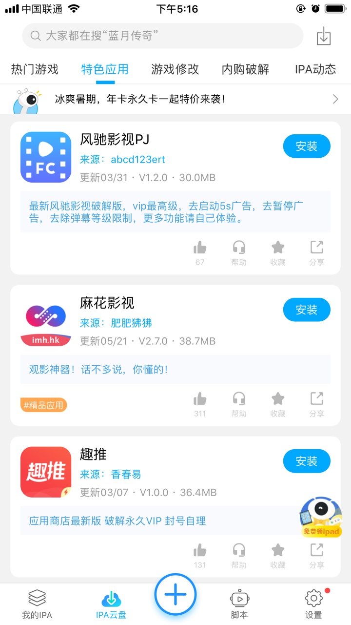 目前提供IPA云盤供用戶選擇所需IPA(游戲)進(jìn)行簽名安裝。安裝后的游戲包,如有附加腳本引擎,啟動(dòng)時(shí)自動(dòng)出現(xiàn)懸浮窗,可在非越獄環(huán)境下使用腳本功能。