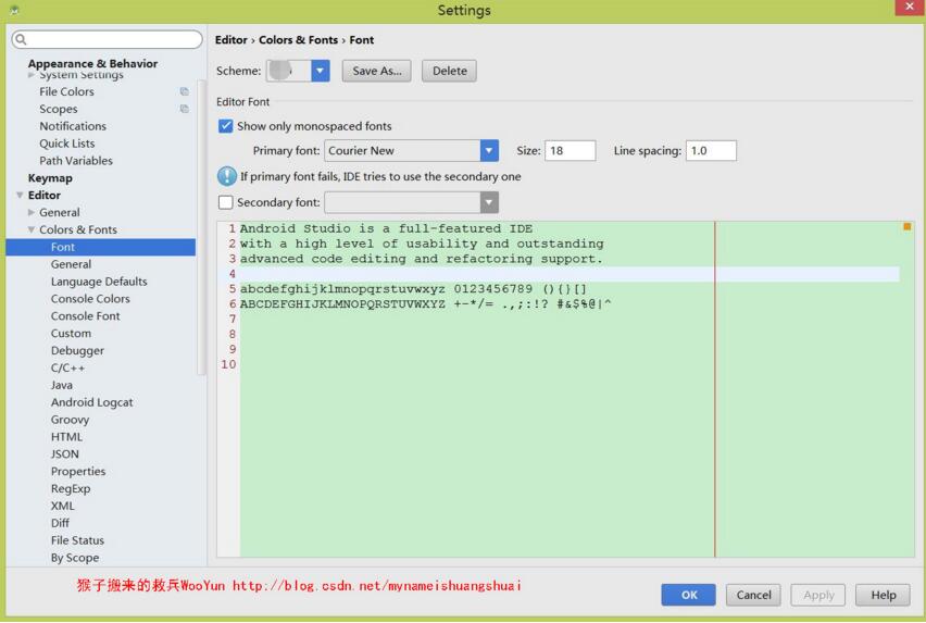 如果想修改編輯器的字體,以及所有的文件顯示的字體,可以如下設置: Settings –> Editor –> Colors & Fonts –> Font 。默認系統(tǒng)顯示的 Scheme 為 Defualt ,你是不能編輯的,你需要點擊右側的 Save As… ,保存一份自己的設置,并在當中設置。之后,在 Editor Font 中即可設置字體。我喜歡用Courier New字體。