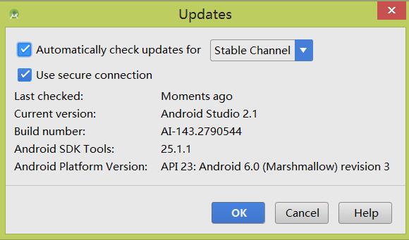 Android Studio支持自動檢查更新。之前尚未發(fā)布正式版時,一周有時會有幾次更新。你可以設置檢查的類型,用以控制更新類型。Settings –> Updates 。勾選 Check for updates in channel ,即開通了自動檢查更新。你可以禁用自動檢查更新。右側的列表,是更新通道。