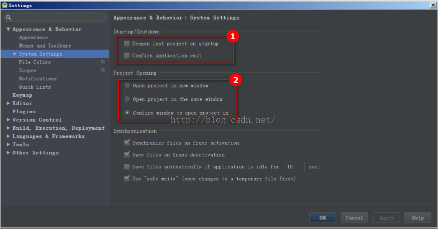 ①禁用自動打開上次關閉工程 ,禁用退出提示 ②打開新項目提示方式