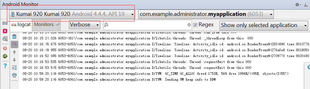 9、檢查android studio 與手機是否連接成功。此處會出現(xiàn)手機名稱??梢远啻吸c擊”andriod monitor“。刷新