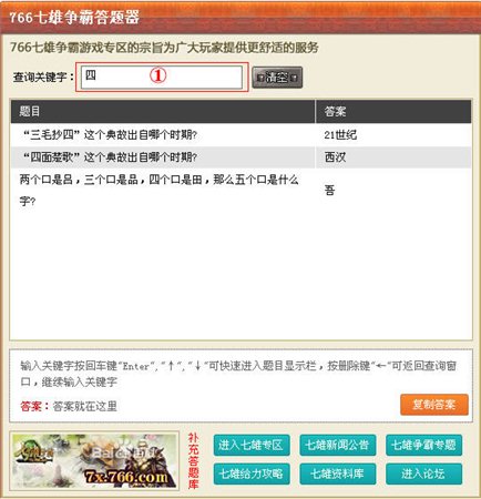 七雄爭霸答題器包含了智慧老人問題和答案。七雄爭霸智慧老人的問題很多所以七雄爭霸答題答案也很多,如果慢慢去找的話很困難。七雄爭霸答題器能讓你快速的找到答案,減少在七雄爭霸中時(shí)間的浪費(fèi)。
