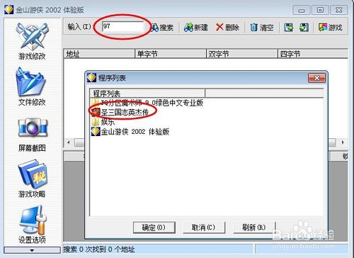 2、打開(kāi)修改器,輸入子龍同學(xué)的武力值97,搜索的時(shí)候會(huì)讓你選擇搜查的程序。選擇你要修改的游戲就對(duì)了。