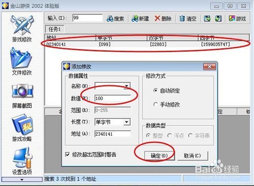 9、雙擊這個(gè)地址,會(huì)彈出一個(gè)對(duì)話框,就可以進(jìn)行修改了,改成你想要的值咯,注意別溢出了,保持在正常范圍內(nèi),確定后就鎖定了這個(gè)值。
