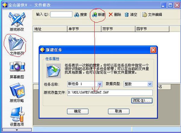 打開(kāi)金山游俠——點(diǎn)擊左側(cè)的文件修改——點(diǎn)擊上面菜單中間的新建——在新建對(duì)話框里選擇瀏覽選定你要修改的存檔文件,如果有數(shù)據(jù)搜索就直接在“輸入”的對(duì)話框里搜索數(shù)據(jù),如果有內(nèi)存地址就點(diǎn)擊文件編輯。修改存檔你首先要在網(wǎng)上找到游戲的修改方法、內(nèi)存地址等,一般用金山游俠修改存檔的文章很少。在文件編輯選項(xiàng)里修改數(shù)據(jù)后點(diǎn)擊定位,就把你修改的結(jié)果寫(xiě)入存檔了。